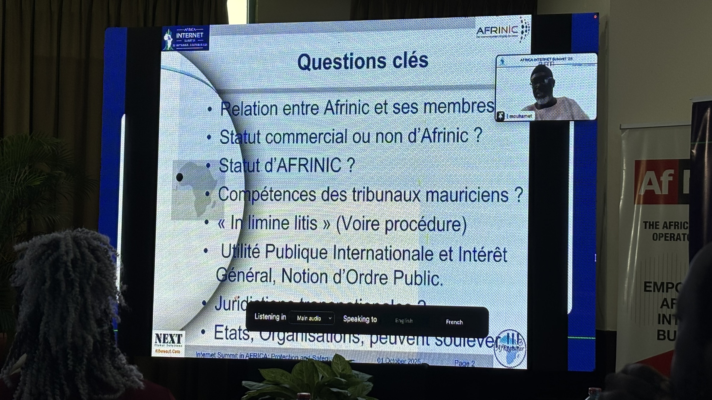 もちろんAFRINICの復調に対する期待は、アフリカ地域では高いものです。AIS2025のDay3、Af*オープンフォーラムは、AFRINIC問題から今後を考えるセッションが並ぶ結果となりました。「Panel Discussions: Protection and safeguards for the Internet governance institutions in AFRICA」では、AFRINIC以外のインターネット運営調整団体がAFRINIC問題から学ぶべきこと、というテーマでした。つまり、AFRINICの一件は、司法に対する手続きに端を発して裁判所命令で機能不全に陥っていったわけですが、同じようなことは他のインターネット運営調整団体でも起こり得るという観測から、これにどう防御を施し、セーフガードを行うか、といった議論が展開されました。その中で、セネガル人でアフリカのインターネットフロンティアの一人、Mouhamed Diop氏は、インターネット運営調整団体は公益的な機能を提供しているのに、私企業と同じように経営破綻から解散といった流れで取り扱われるべきでない、と主張しました(下の写真。英語の発言でしたがスライドはフランス語です)。
