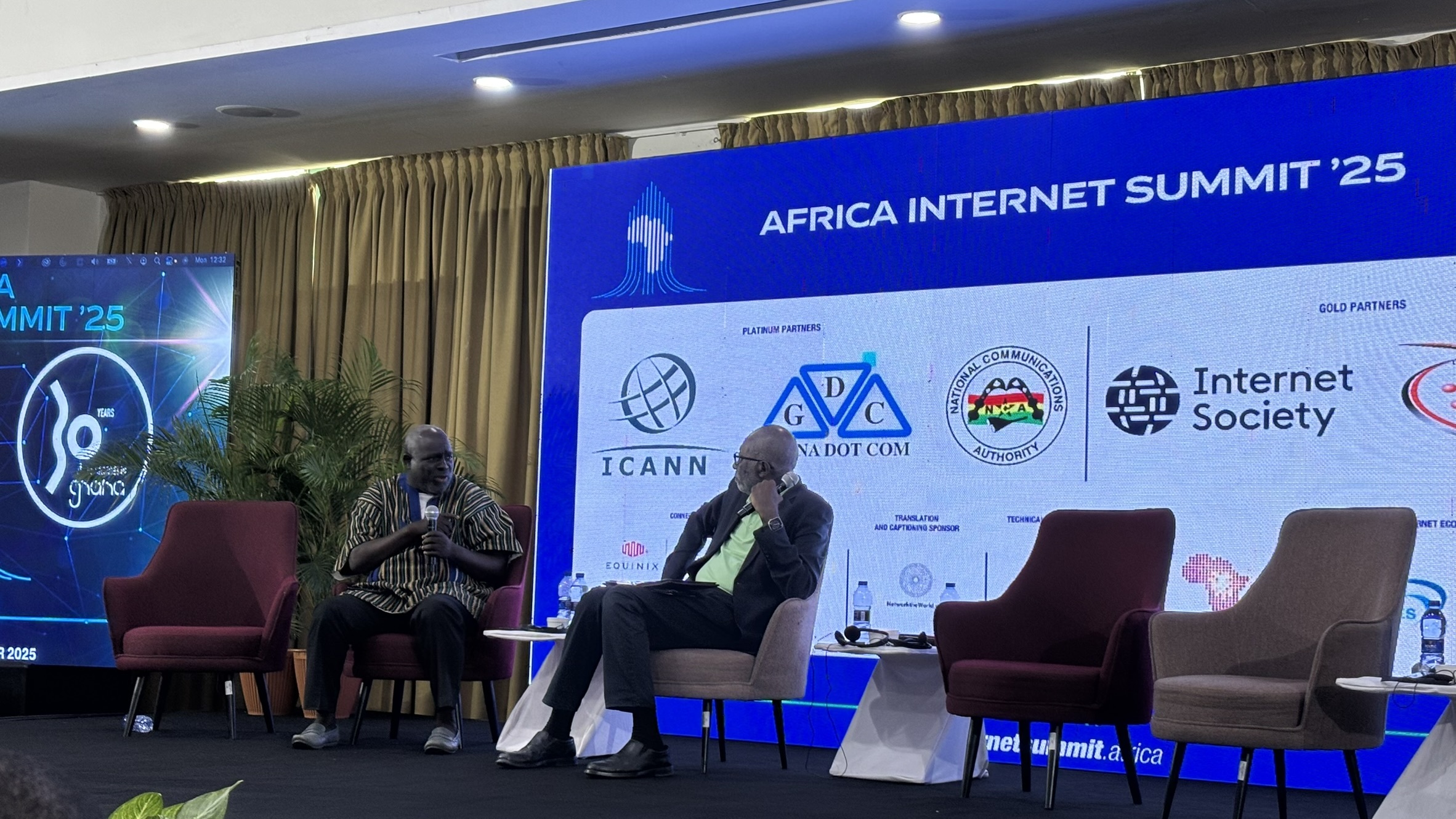 ガーナのインターネットの先陣を切り黎明期を支えたNCS社を中心に、黎明期前後の15年ほどを振り返りました。「NCS歴史家」を自称するErik Akumieh氏による発表の後、民間、政府、アカデミアからのパネリストが、それぞれの視点から振り返りました。またその次のパネルでは、そのNCSを含みガーナにおけるコンピュータサイエンス研究を始動し、ガーナに、そしてアフリカ全体にインターネットを持ち込んだNii Quaynor氏と、トーゴのフロンティアであるAlain Aina氏による対談となりました。Quaynor氏とAina氏は押しも押されもしないアフリカインターネットのツートップといってよい方々で、AIS会期中、登壇、セッション司会、フロアからの発言と、大変活発に動き回っていました。この対談はパネルとは違い、30年前を懐かしむ趣向のもので、途中Aina氏が当時のモデムの音をマイクで聴衆に聞かせるシーンもありました。