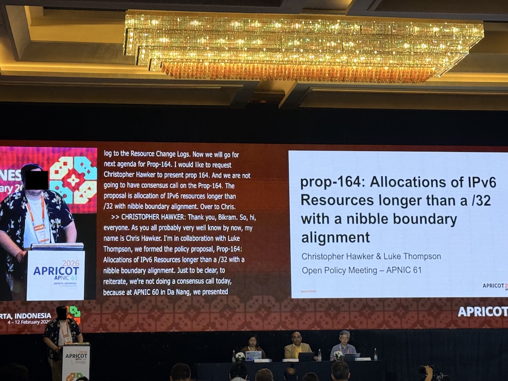 現在、APNICにおけるIPv6アドレスの最小割り振りサイズは /32と定められていますが、本提案は、この最小割り振りサイズを/36へ縮小しようとするものでした。本OPMでは提案者の意向により、コンセンサス確認は行われませんでした。
